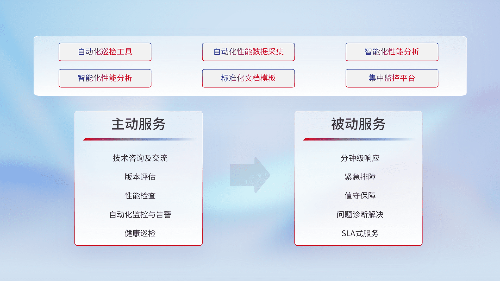 智能化工具和标准化文档,,,,保障服务质量,,提供主动服务(包含技术咨询、、版本评估、、、性能检查、、自动化监控与告警、、、健康巡检)和被动服务包含(分钟级响应、、、、紧急排障、、值守保障、、问题诊断解决、、SLA服务)。。。